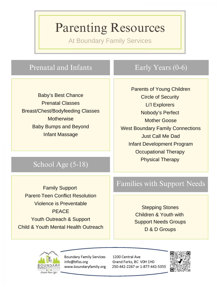 Boundary Family Services provides a wide variety of programs to meet the interests and needs of children, youth, families and senior's throughout the Boundary with the main hub being the Glanville Family Centre in Grand Forks. Some programs require an appointment while other programs are open for drop in. Accessing most programs just requires that you contact us for an intake appointment or drop in time but some programs have specific guidelines and require a referral.